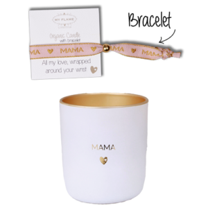 Een heerlijke geurkaars gemaakt van biologische sojawas. Deze kaars heeft de geur Fresh Cotton en brandt ca. 50 uur. Deze sojakaars wordt gesierd met de tekst ‘Mama’. Een leuk detail aan deze kaars is dat het inclusief armbandje is met mama quote. Superleuk 2-in-1 cadeau voor Moederdag, verjaardag of zomaar voor de beste, liefste bonus…