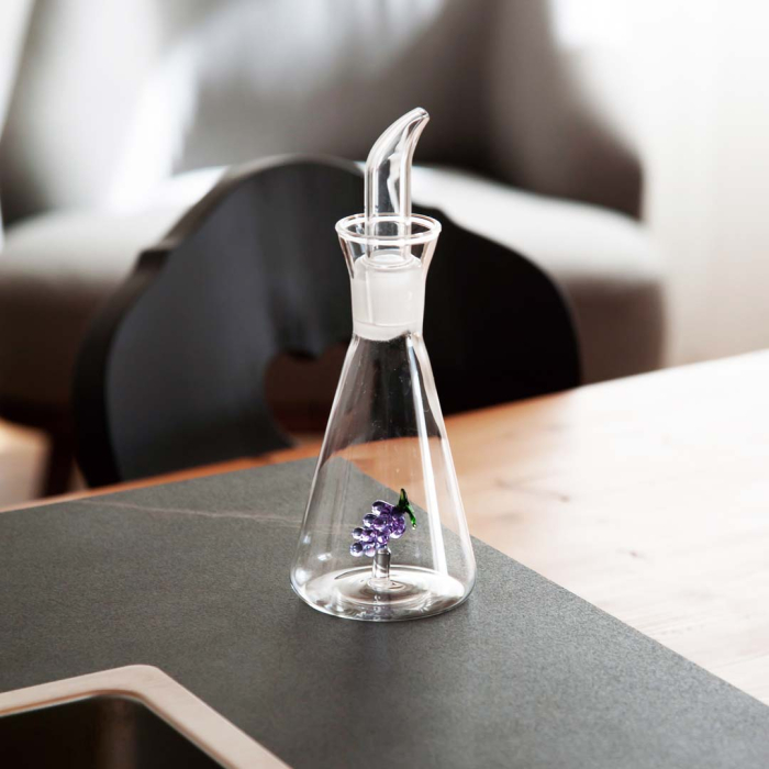 Azijnfles van borosilicaatglas met gekleurde glazen decoratie met een tros druiven. 250ml