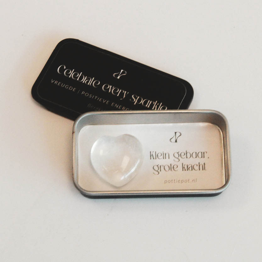 Bergkristal staat voor helderheid en energie. Dit blikje is een klein feestje op zich, met een hart dat je helpt de mooie momenten te vieren en dankbaar te zijn. Een sprankelend cadeautje dat altijd licht en positiviteit brengt.