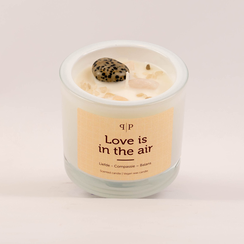 De Love is in the air geurkaars is gevuld met rozenkwarts en dalmatiër jaspis. Rozenkwarts is bij uitstek de steen van het hart en de liefde. De steen opent het hart om liefde te ontvangen en om liefde te geven. De steen trekt harmonieuze liefdes- en vriendschappelijke relaties aan en bevordert ook eigenliefde en zelfacceptatie. Dalmatiër jaspis maakt je oprecht en eerlijk en zorgt voor balans in lichaam, ziel en geest.